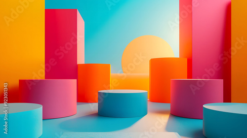 Eye-catching 3D art showcasing colorful cubes and a prominent circle within a vibrant exhibition space setting. Exhibition display place.