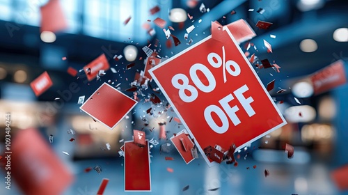 Eye-Catching Red Sign Showing Huge Discount of 80% Off with Floating Price Tags, Shopping Background, and Dynamic Burst Effect for Sale Promotions