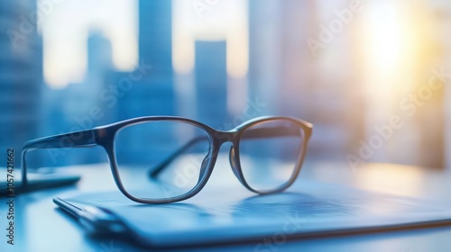 Eyeglasses and working documents on table, business analysis graph