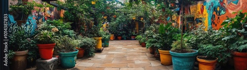 Eye-level shot of a whimsical container garden, graffiti-covered pots, lush greenery, vivid urban environment, lively and creative atmosphere