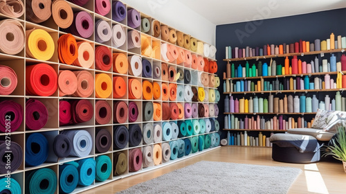 Fabrics and fabric rolls organized on shelves. Workshop and shop for fashion designers, dressmakers, pattern makers and tailors. Cloth store. Shelves and walls full of organized fabrics.