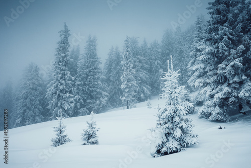 Fabulous frozen fir trees after a heavy snowfall on a cold winter day. Happy New Year concept.