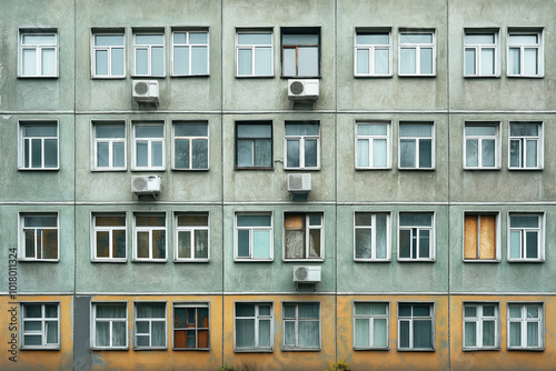 Facade of an old multi-story residential building with uniform windows and some air conditioners. The building shows signs of wear and a lack of maintenance.