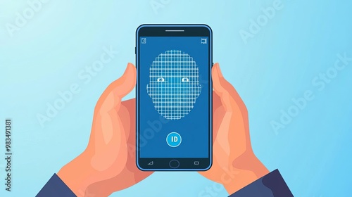 Face ID Log in Scan Hands holding a smartphone with a facial scan grid on the screen, Face ID technology, no face, flat design illustration