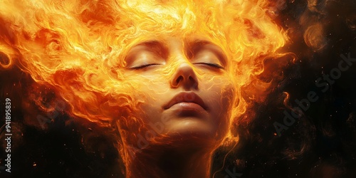 Face Made of Flowing Lava, Eyes Closed, Surrounded by Bright Flames, Abstract, Background, Face, Lava, Fire, Digital Art, Fiery, Surreal, Artistic, Fantasy, Human Form