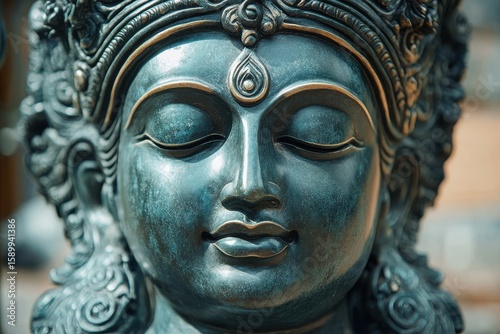 face of the statue of Lord Venkateswara with a large crown and closed eyes, Lord Venkateswara's face in the statue