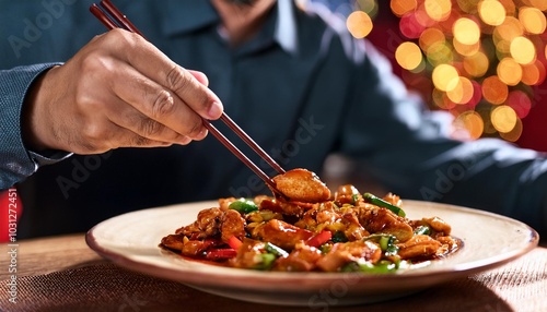 Faceless man eat Szechuan Chicken in restaurant with bokeh background. Chinese Food.