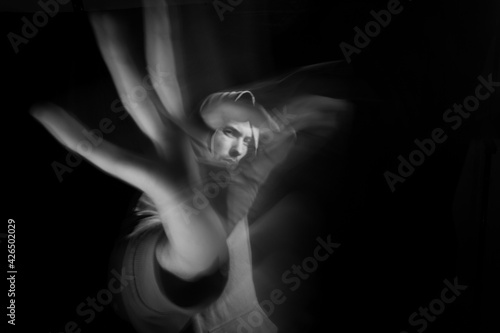 Facial face of a man in the dark. Art photography. Black-white art picture with a man. Portrait of man with blurred motion