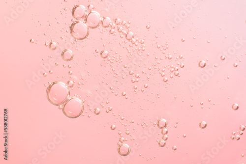 Facial serum oil surface with water bubbles. Abstract cosmetic liquid pink background for advertising and presentation of cosmetic products.