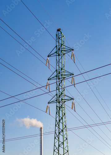 Factory chimney with smoke. Industrial pipe. Blue sky at sunny day. Air pollution. power line tower