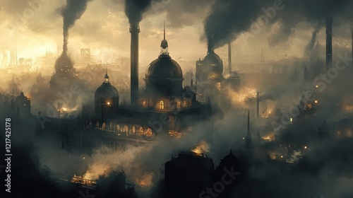 Factory chimneys emitting dense smoke into the atmosphere, creating a thick layer of smog, dark industrial landscape..