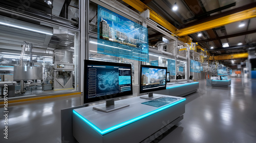 Factory Control Room with Engineers and Digital Dashboards