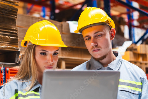 Factory manager, foreman worker checking stock inventory on good shelf in delivery storehouse of logistic storage warehouse, shipping distribution business, package box industry job for retail market