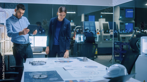 Factory Office Meeting Room: Male Chief Engineer Holds Digital Tablet Computer, Shows Screen to Female Project Manager, They Talk, Find Optimization Solution. Modern Industry 4.0 CNC Machinery