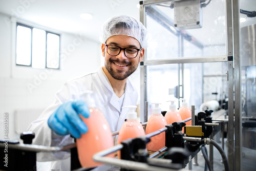 Factory technologist working at production line conveyer machine checking quality of liquid soap or detergent in chemicals industry.