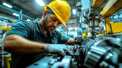 Factory worker in hard hat preparing CNC lathe machine, focused environment, industrial setting, machinery and tools arranged, attention to detail and safety emphasized.