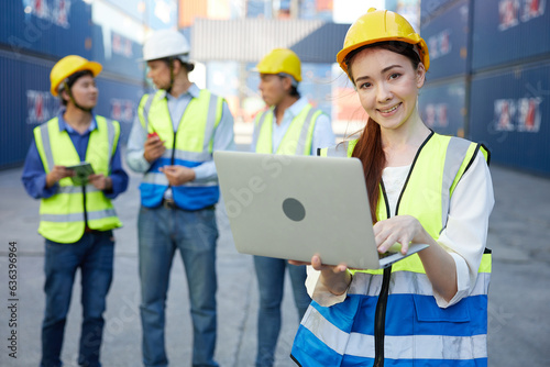 factory worker or engineer working on laptop computer in containers warehouse storage