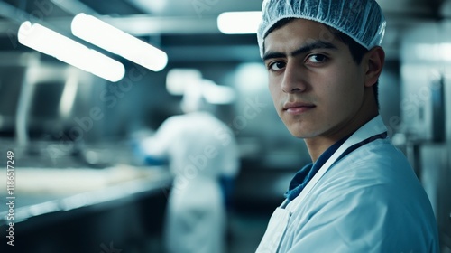 Factory Worker Portrait: A young man in a white uniform and hairnet looks directly at the camera with a determined expression, showcasing the dedication and focus of blue-collar workers.