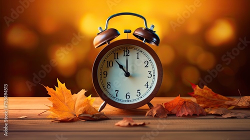 Fall Back into Daylight - Concept of Saving Time with Clock and Autumn Leaves on Wooden Table