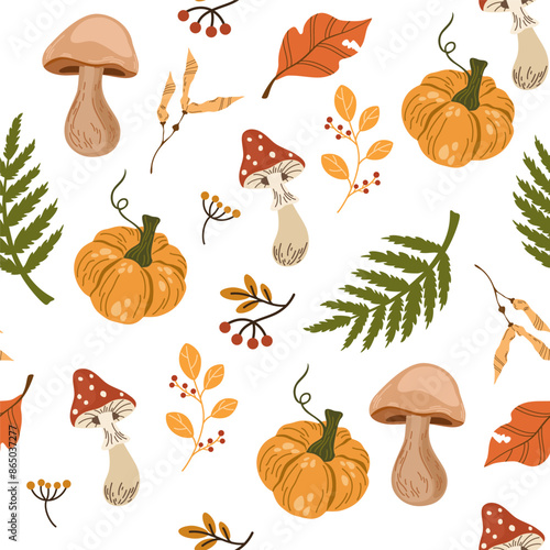 Fall flat vector seamless pattern. Autumn decorative background with pumpkins. Forest leaves and mushrooms texture. Fall season foliage and berries wrapping paper, textile, wallpaper design