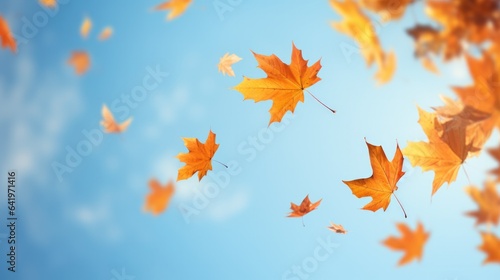 Fallen leaves falling from trees background sky. Falling autumn beech leaves against clear blue sky.
