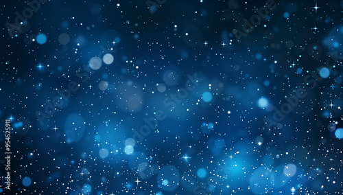 Falling confetti on blue background, abstract background with dark blue and gold. Golden light particles Bokeh on navy blue background, celebration concept.