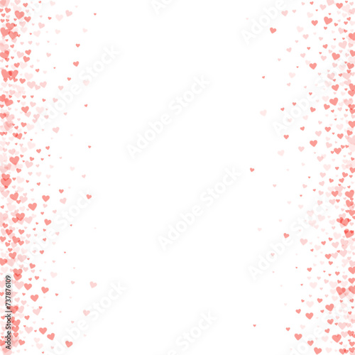 Falling hearts valentine card template. Red hearts scattered on white background. Chaotic falling hearts vector illustration.