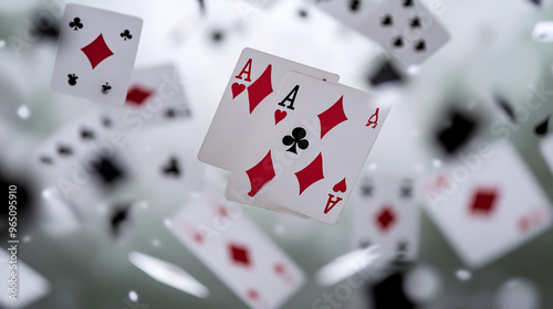 Falling playing cards in a dynamic display during a card game setup with aces and diamonds in mid-air