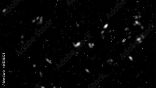 Falling snow isolated on black background. Falling snow at night. Bokeh lights on black background, flying snowflakes in the air. Winter weather. Overlay texture.