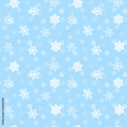 Falling snowflakes on blue background as seamless endless pattern for print cards, invitations and fabric. Web design texture elements for winter season