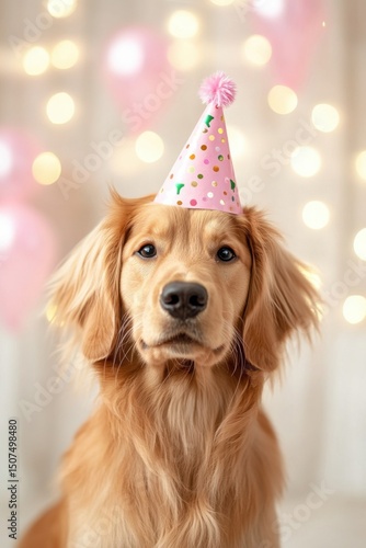 Family celebrates a birthday with their dog wearing a festive party hat in a joyful gathering