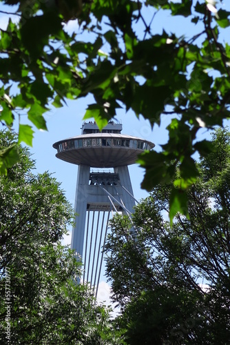 famous bridge novy most with ufo saucer building on the top in Bratislava viewed through green trees and blue sky in summer in slovakia