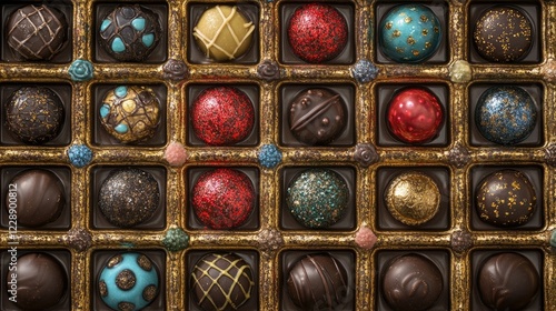 Fancy chocolate bonbons in rich colors, neatly arranged in a golden tray.