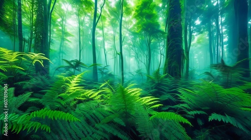 Fantastic forest with fog and ferns in the foreground. Generative ai