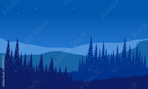 Fantastic view of the mountains with forest at night from the edge of tje city. Vector illustration