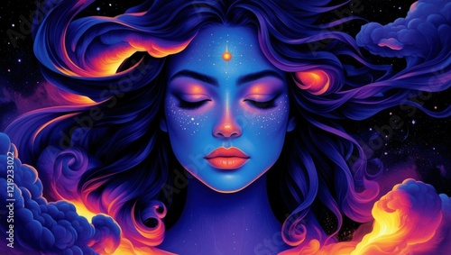 Fantasy portrait, ethereal blue-skinned woman, closed eyes, flowing dark hair, cosmic background, vibrant orange and purple clouds, starry night sky, dreamy atmosphere, digital painting, surreal art,