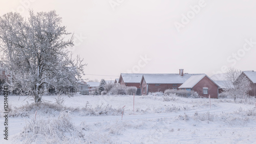 Farm barn and house in a cold wintry landscape with snow anf frost