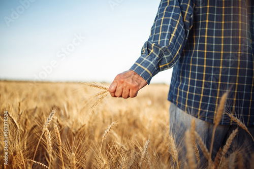 Farmer holds a few spikelets of wheat in his hand standing in the middle of the grain field. Man working on the farm checking the new harvest touching ears of the wheat. Agricultural concept.