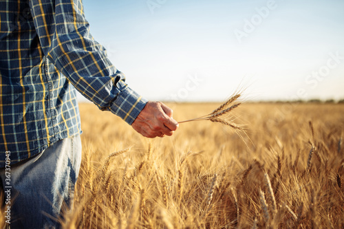 Farmer holds a few spikelets of wheat in his hand standing in the middle of the grain field. Man working on the farm checking the new harvest touching ears of the wheat. Agricultural concept.