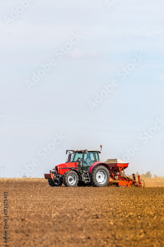 Farmer seeding, sowing crops at field. Sowing is the process of planting seeds in the ground as part of the early spring time agricultural activities.