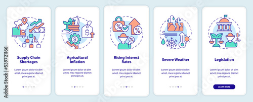 Farming economics drawbacks onboarding mobile app screen. Walkthrough 5 steps editable graphic instructions with linear concepts. UI, UX, GUI template. Myriad Pro-Bold, Regular fonts used