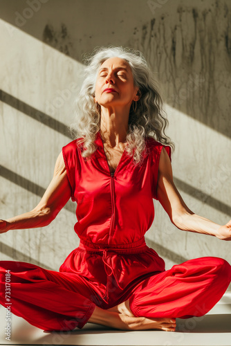 Fashionable senior woman practicing yoga in the studio. Yoga concept.