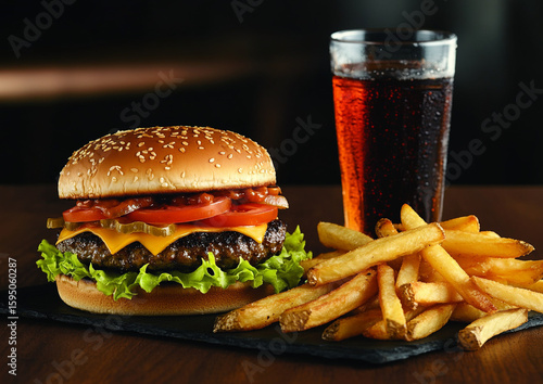 Fast food meal with cheeseburger with french fries and glass of cola soda drink on wooden table.Macro.AI Generative.