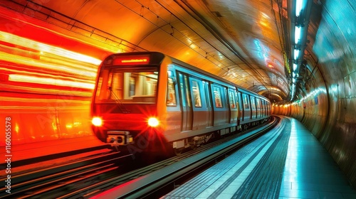 Fast Moving Subway Train in Vibrant Urban Underground Tunnel