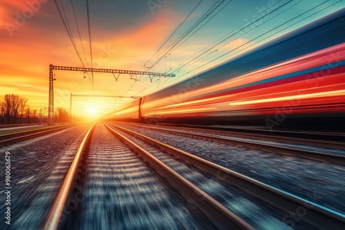 Fast passenger train on tracks at sunset Blurred commuter train Station under colorful sky Evening railway travel Industrial scene