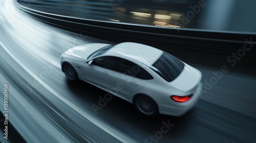Fast white car navigating a rainy urban highway at night with blurred motion effect and illuminated surroundings