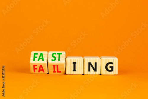 Fasting or failing symbol. Concept words Fasting or Failing on wooden cubes. Beautiful orange table orange background. Business fasting or failing concept. Copy space.