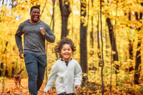 Father and daughter having fun running in autumn park