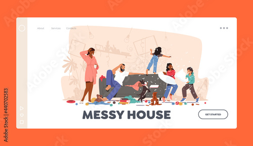 Father and Mother Shocked with Home Mess Landing Page Template. Naughty Hyperactive Children Characters Fighting