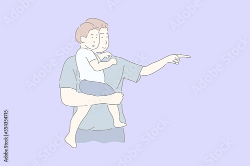Father and son concept, Man held his son. Then pointed his hand something with drawing character vector.